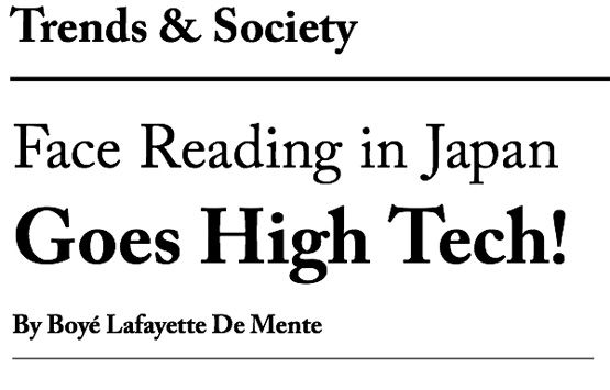 Face Reading in Japan Goes High Tech!THE ancient Asian art of face reading has gone high tech in Japan. Several years ago, Japanese scientists began applying high-speed photographic technology to the art, adding a new dimension to understanding human feelings and communication in a development that could eventually change most human interactions.